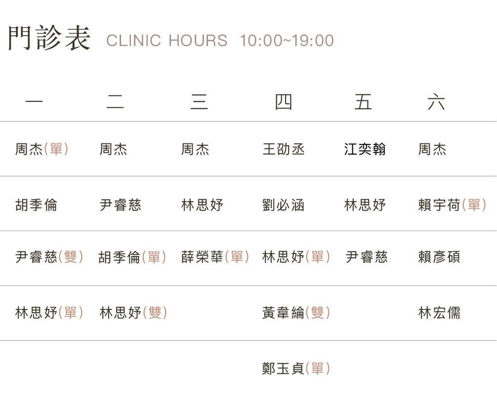 門診表 線上預約 門診表 線上預約 首頁 - 關於我們 - 預約門診 APPOINTMENT預約門診 CLINIC HOURS門診表 一二三四五六 10:00~19:00 Dr.周杰(單)Dr.周杰Dr.周杰Dr.王劭丞Dr.江奕翰Dr.周杰 Dr.胡季倫Dr.尹睿慈Dr.林思妤Dr.劉必涵Dr.林思妤Dr.賴宇荷(單) Dr.尹睿慈(雙)Dr.胡季倫(單)Dr.薛榮華(單)Dr.林思妤(單)Dr.尹睿慈Dr.賴彥碩 Dr.林思妤(單)Dr.林思妤(雙)Dr.黃韋綸(雙)Dr.林宏儒 Dr.鄭玉貞(單) CONSULATION線上預約 聯絡姓名 先生 小姐 聯絡電話 Email 指定醫師 - 請選擇 - 周杰醫師 賴彥碩醫師 尹睿慈醫師 劉必涵醫師 劉璦泇醫師 黃韋綸醫師 方便聯絡時間 早上10:00-12:00 下午12:00-14:00 下午14:00-16:00 下午16:00-18:00 洽詢項目 需求說明 確認送出 預約門診RESERVATION 客製化諮詢服務,您的美麗,由我們守護。 初診 WEB 預約