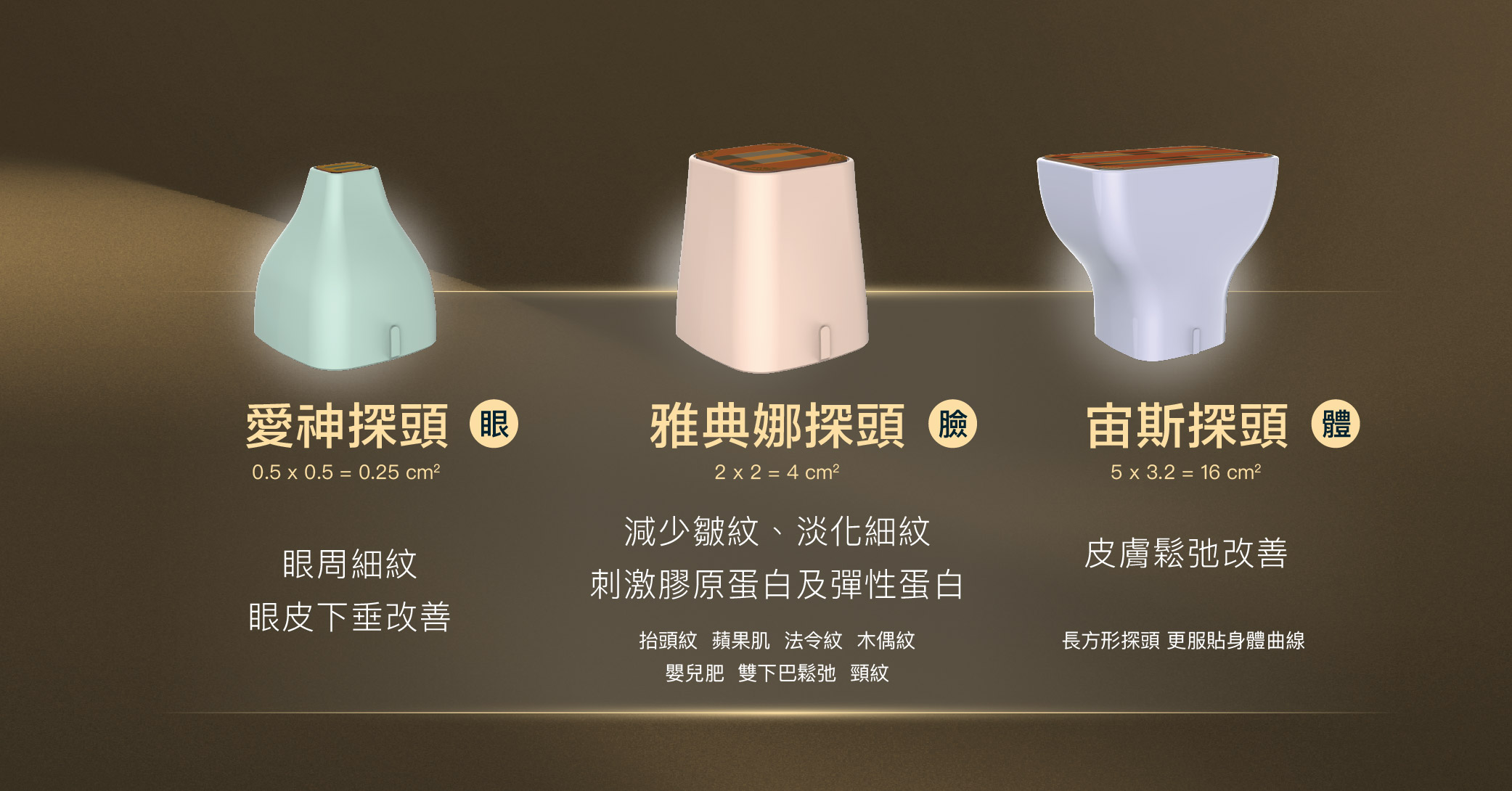 治療面積為0.25平方公分,每顆探頭為600發,讓單次治療可覆蓋面積和效果提升,改善眼皮下垂和眼周細紋,幫助緊實眼周肌膚;眼周探頭為免下壓施打設計,可減少眼球疼痛感,大幅提升療程舒適度。